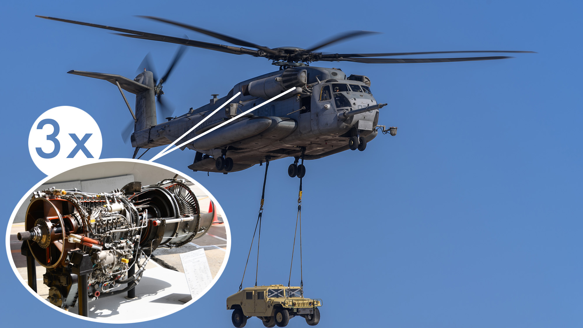 Helikopterlerdeki motor sayısının artırılması, yüksek beygir gücüne olan ihtiyaçtan doğmuştur. Çoklu motor konfigürasyonları bu taşıtlarda OEI (One Engine Inoperative) operasyonlarına imkân vermektedir. Bununla beraber çok motorlu helikopter tasarımları OEI’dan ziyade daha fazla kaldırma kuvveti sağlamak için yapılmaktadır. Bu artırım ise üçüncü motorun eklenmesiyle (toplam güç %50 artmakta) kaldırma miktarını ortalama 2 katına çıkarmaktadır. Sikorsky CH-53E Super Stallion, Mil Mi-26’dan sonra dünyanın en geniş ve en kabiliyetli çok motorlu helikopteridir. CH-53E platformunda üçüncü motorun eklenmesiyle faydalı yük 8 tondan 16 tona çıkmış, tırmanma oranı da 6.000 feet/ dakika seviyesine yükselmiştir. Üç adet General Electric T64-GE-419 motora sahip olan CH-53E, üçüncü motora ihtiyaç duymadan 32 ton ağırlıkta havada askıda duruş (hover) yapabilmektedir. Bununla beraber helikopterin genel boyutlarında %10 artış olmuştur.