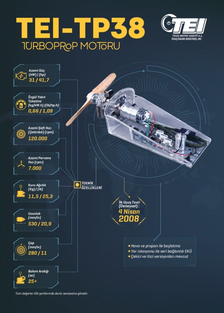 TEI öncelikli olarak ulusal, uzun vadede ise uluslararası pazarda yerini alması öngörülen rekabetçi, yenilikçi ve yüksek teknolojiye sahip, İnsansız Hava Araçları’nın (İHA) gaz türbin ihtiyacına yönelik turbojet ve turboprop motorlar geliştirmektedir. TEI’nin bu kapsamdaki Ar-Ge çalışmaları 2004 yılından bu yana devam etmektedir. Bu çalışmalar kapsamında TP38 turboprop motoru geliştirilmiştir.