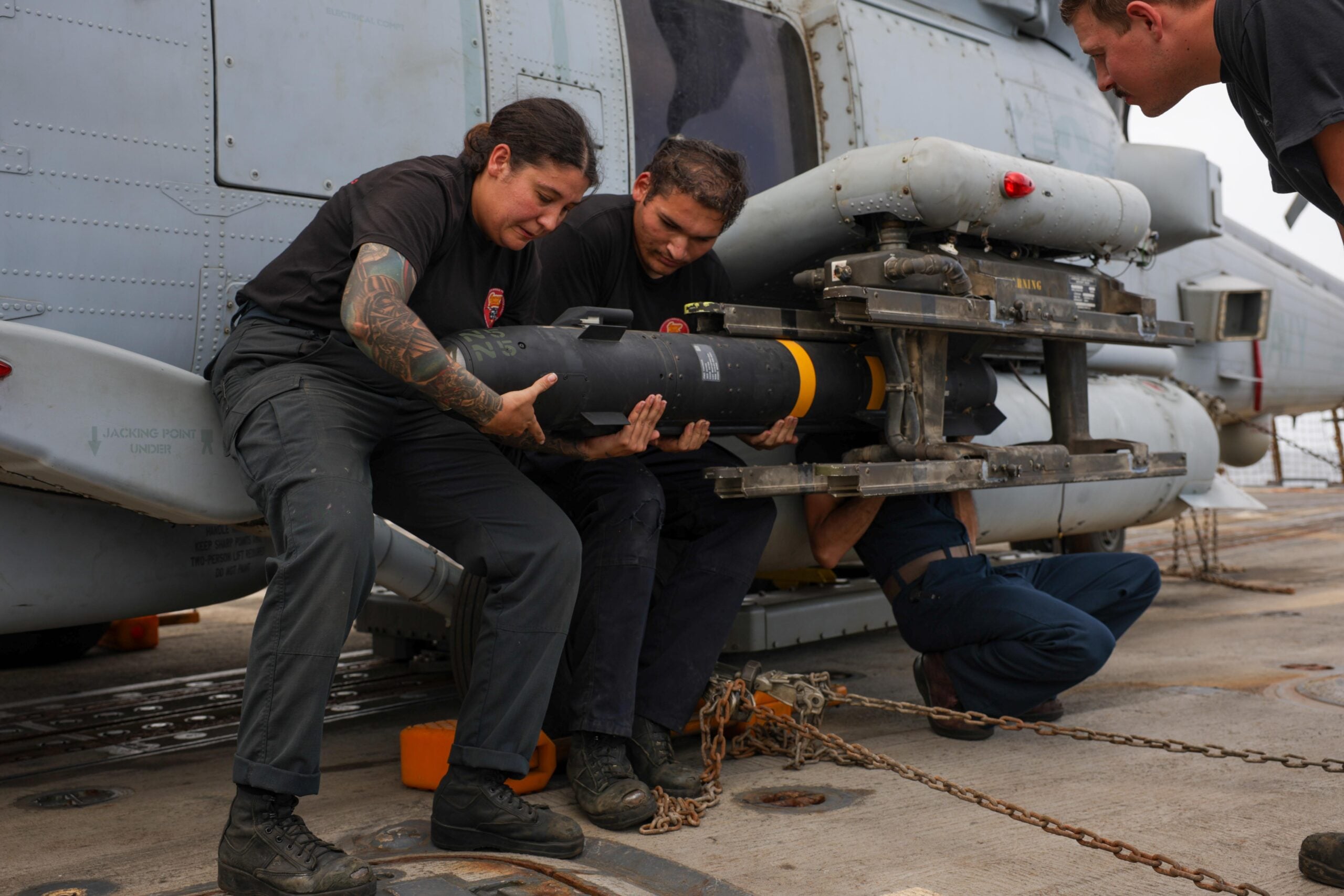 MH-60R Sea Hawk helikopterine Hellfire füzesi yüklenirken.