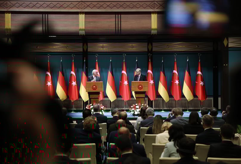 Cumhurbaşkanı Erdoğan, Almanya Federal Cumhuriyeti Cumhurbaşkanı Steinmeier ile ortak basın toplantısı gerçekleştirdi. Erdoğan, “NATO müttefikimiz Almanya ile güvenlikten ekonomiye, kültürden bilime, her alanda yoğun ilişkilere sahibiz. 50 milyar doları bulan ikili ticaret hacmimizi dengeli biçimde, 60 milyar dolar seviyesine ulaştırmayı hedefliyoruz” dedi.
