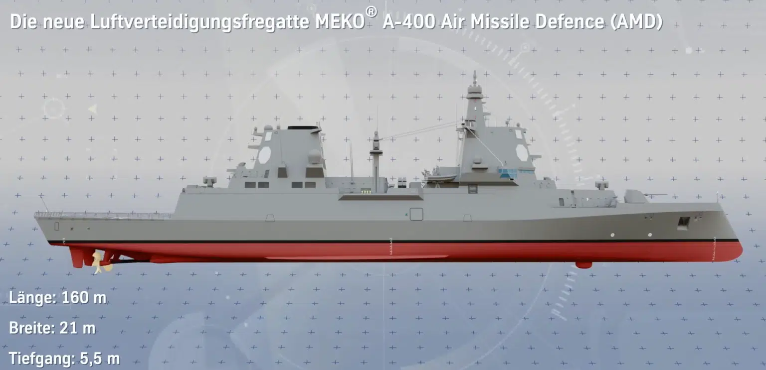 MEKO A-400 AMD tasarımı, 10.000 ton deplasmana sahip olup geminin gövde uzunluğu 160 metre, en geniş noktası 21 metre ve suya batma derinliği ise 5,5 metredir. Mevcut F125 tasarımına kıyasla oldukça önemli bir büyüklük artışı sunmasıyla beraber geminin, saatte 32 knot hız ve 4.000 deniz mili menzile sahip olması öngörülmektedir. Ayrıca, tasarımda iki NH-90 tipi helikopter için hangar alanı bulunmaktadır.