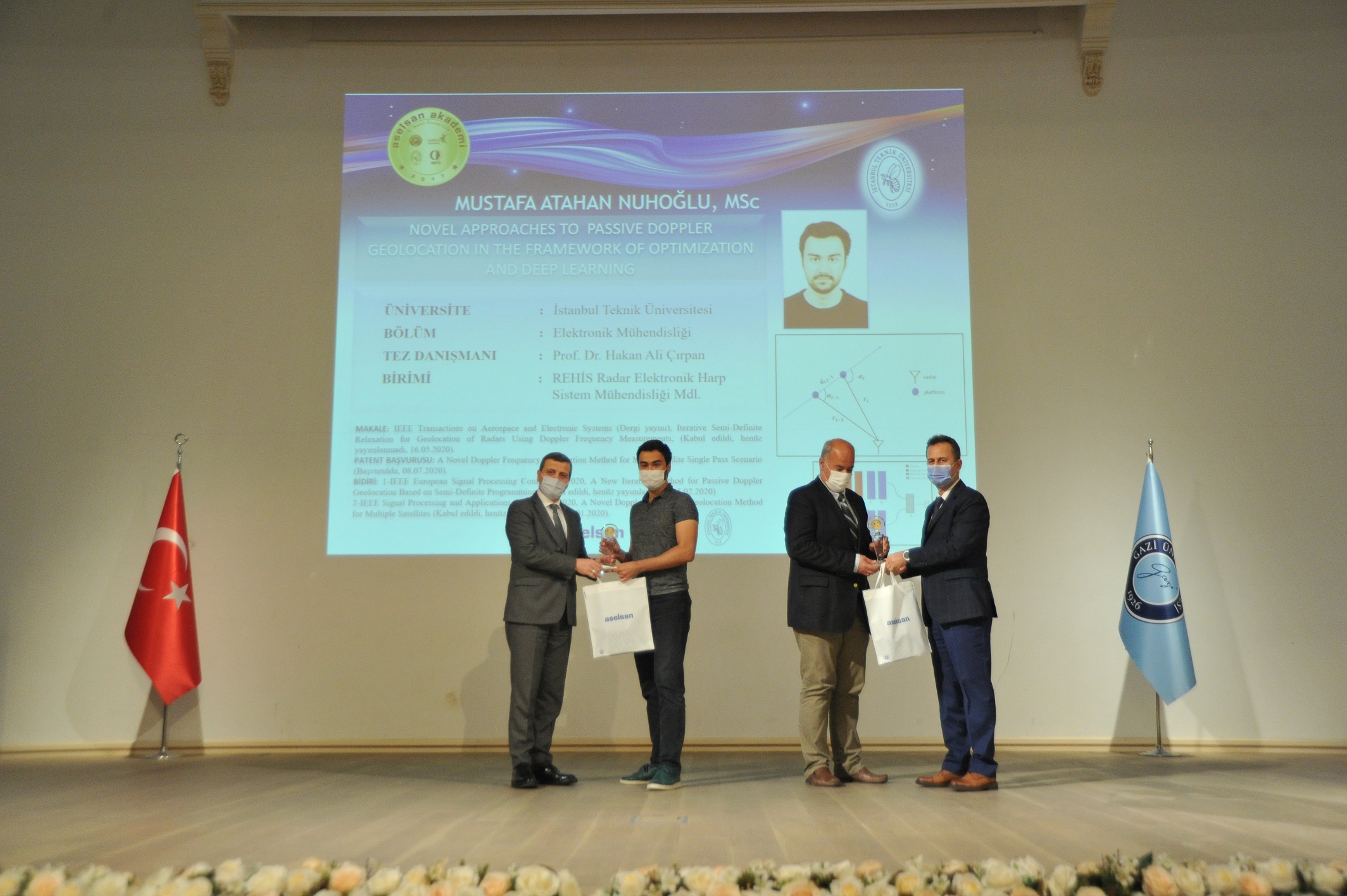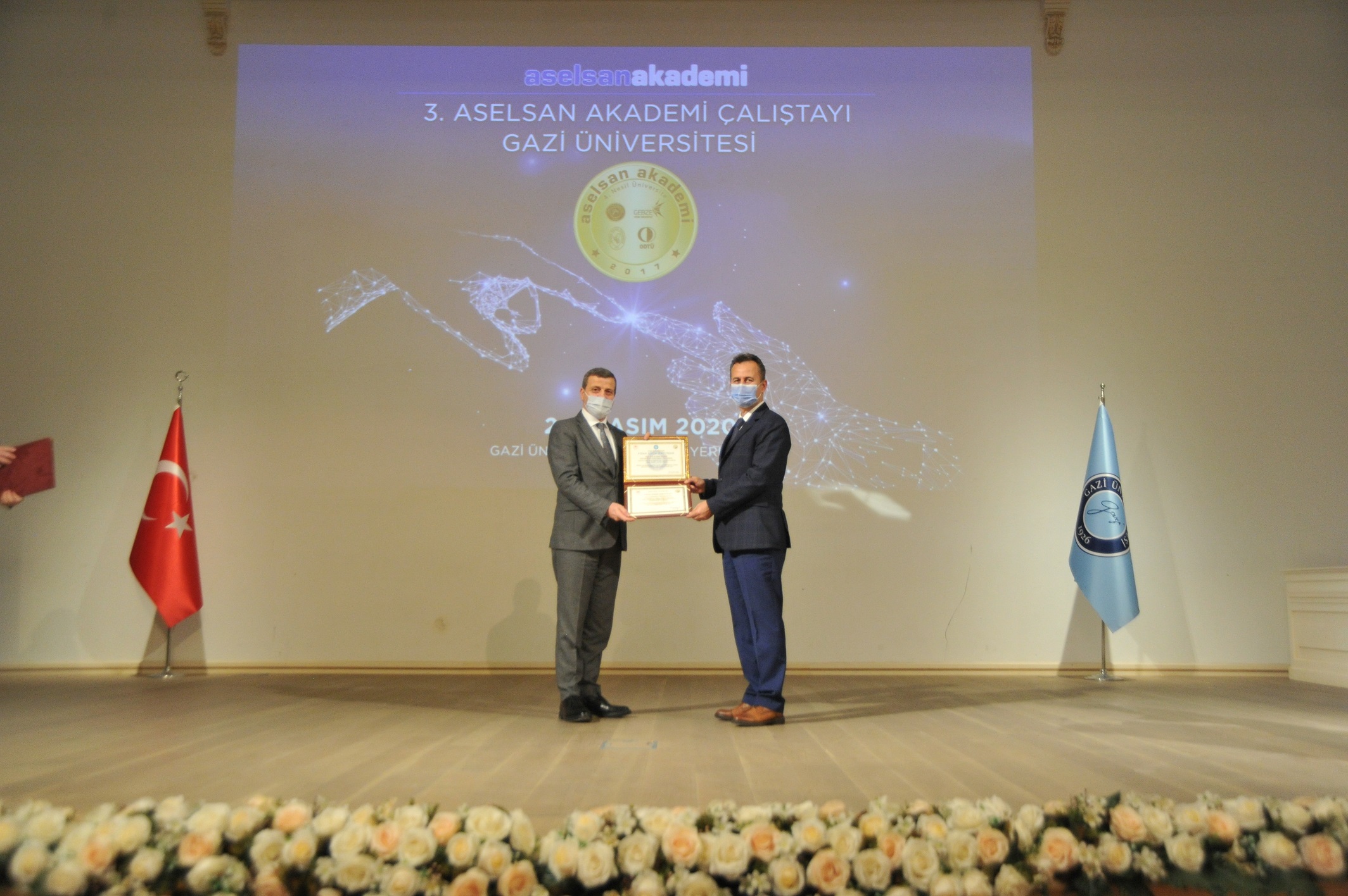 Gazi Üniversitesi Merkez Yerleşkesi’nde, protokol kapsamında yer alan Gazi Üniversitesi, İstanbul Teknik Üniversitesi, Gebze Teknik Üniversitesi ve Orta Doğu Teknik Üniversitesi’nin üst düzey yetkililerinin ve öğretim üyelerinin katılımıyla, COVID-19 önlemleri alınarak biraraya gelinen etkinliğin son gününde ASELSAN Akademi’nin ilk mezunları da poster sunumları ile yer aldı. Protokol konuşmalarının ardından bu yıl mezun olan 40 öğrenciye mezuniyet anısı takdim edildi. Üniversitelerin Akademi Kurulu temsilcilerinin oylarıyla en iyi üç tez çalışmasının belirlendiği Tez Yarışması’nın kazananlarına ve tez danışmanlarına ödülleri verildi.
