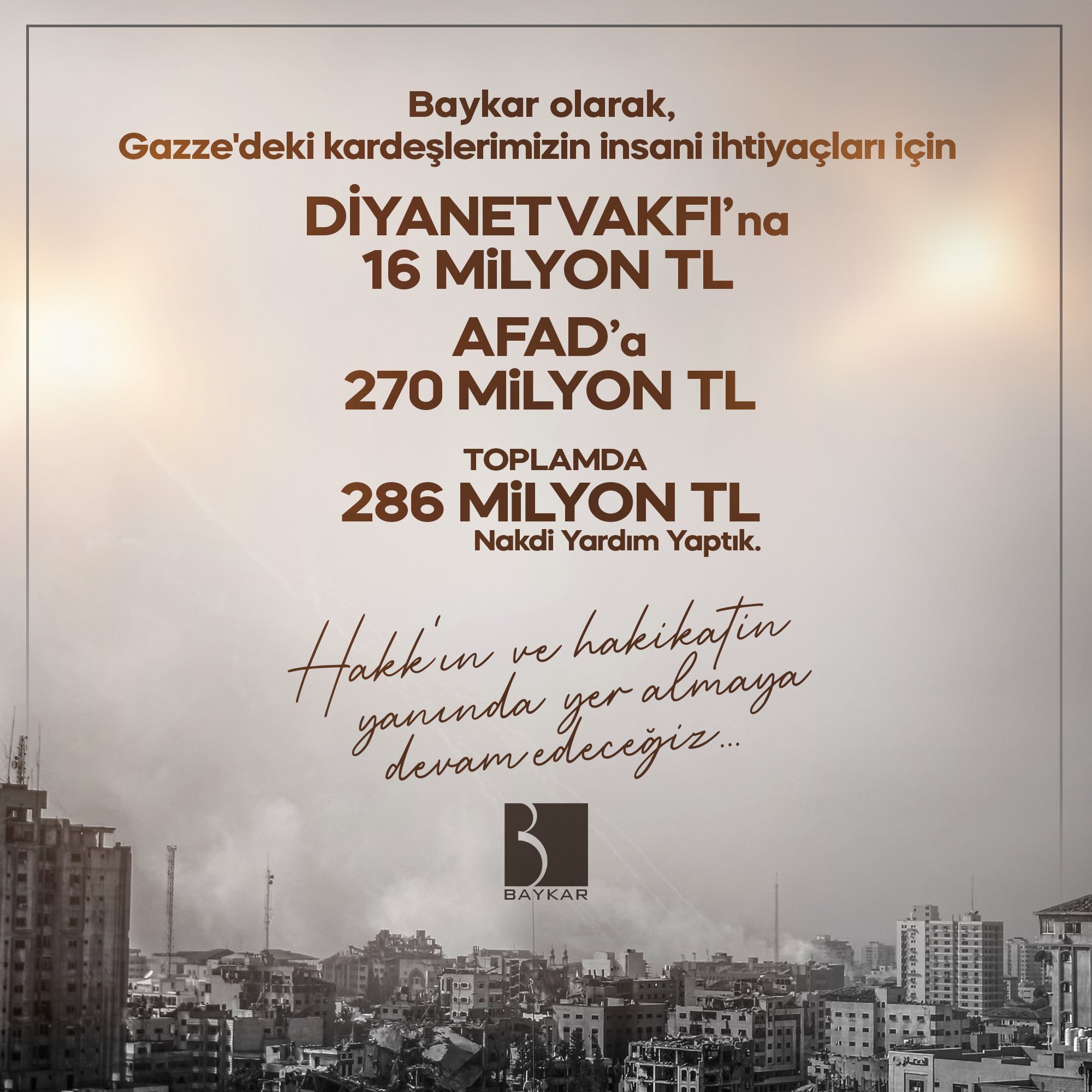 İsrail işgali altında bir insanlık dramının yaşandığı Gazze’ye yönelik insani yardım ulaştırmak için harekete geçen Baykar, 286 milyon liralık yardım yapacağını duyurmuştu. Baykar tarafından Gazze için yapılan 286 milyon liralık bağış, AFAD ve Türkiye Diyanet Vakfı’na (TDV) teslim edildi. Gerçekleştirilen bağışla birlikte AFAD ve TDV koordinesinde Gazze’de yaşayan Filistinli mazlumlara acil olarak gıda, ilaç ve tıbbi destek ekipmanlarının yer aldığı insani yardım malzemelerinin ulaştırılması hedefleniyor.