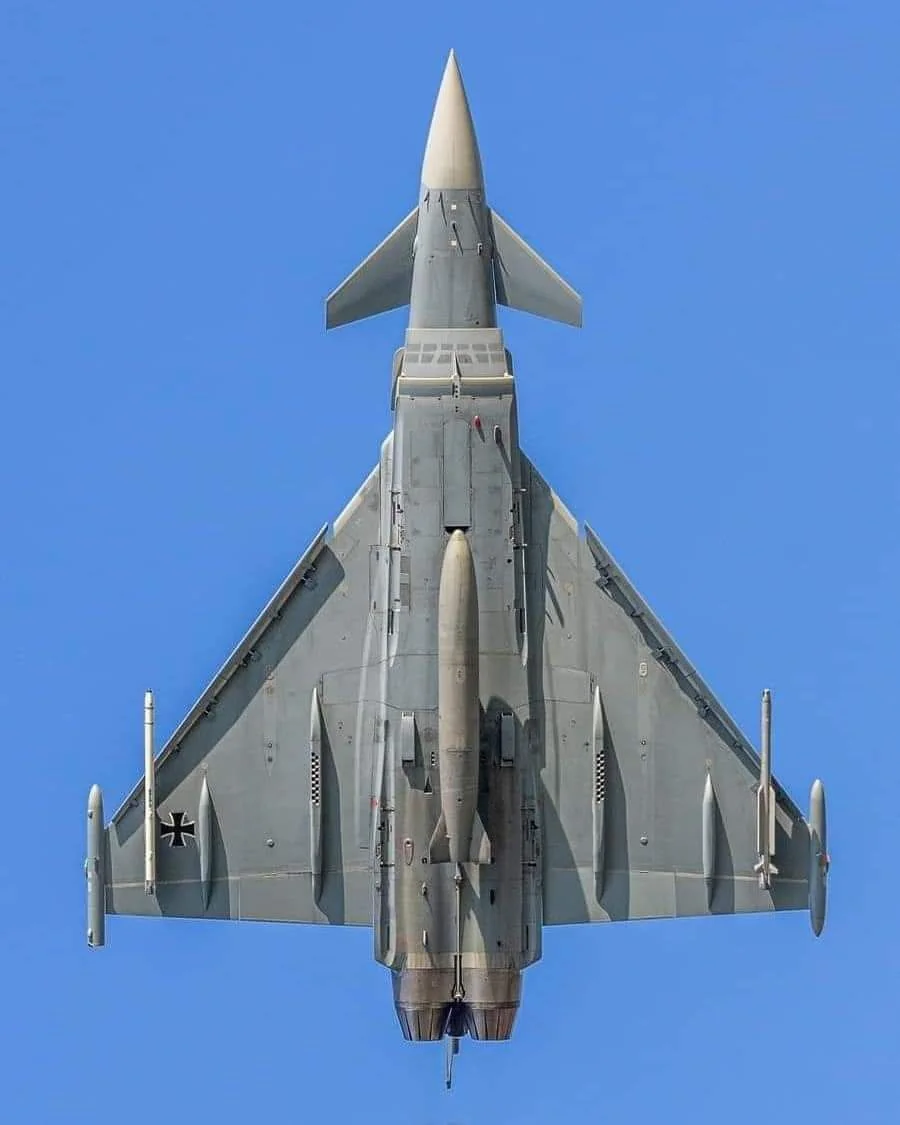 Eurofighter Typhoon’da toplamda 13 adet hardpoint vardır. bu da çeşitli harici yakıt tankları ve silah konfigürasyonlarının uygulanmasına imkan tanır. Burada ufak bir hatırlatma da bulunalım. Hardpoint (Sabit Nokta/Yükleme Noktası): Uçak gövdesinde veya kanatlarında, harici yüklerin (bombalar, füzeler, yakıt tankları, podlar vb.) güvenli bir şekilde takılabileceği güçlendirilmiş ve önceden belirlenmiş noktalara verilen genel isimdir. Hardpoint, sadece bir bağlantı noktası olabilir veya elektrik ve veri bağlantıları gibi ek özelliklere sahip olabilir. Pilon (Aski/Taşıyıcı Kol): Harici yüklerin (özellikle bombalar ve füzeler) uçağa takılmasını sağlayan yapısal bir elemandır. Pilon, hardpoint’e bağlanır ve yükü taşıyarak aerodinamik bir şekilde konumlandırır. Pilonlar genellikle aerodinamik şekillere sahiptir ve yükün güvenli bir şekilde fırlatılması veya bırakılması için mekanizmalar içerebilir.
