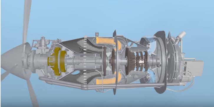 Turbojet motor dışındakiler turbojetin türevleridir. Turboprop motorların tek farkı basit bir şekilde pervane ve dişli kutusu içermesidir. Yani türbinden elde ettiği enerjiyi dişli kutusu ve mil yardımıyla pervaneye aktarır. Gerekli İtki oluşmuş olur. Görselde Hürkuş Temel Eğitim Uçağında kullanılan PT6A-68T Turboprop motoru görebilirsiniz.