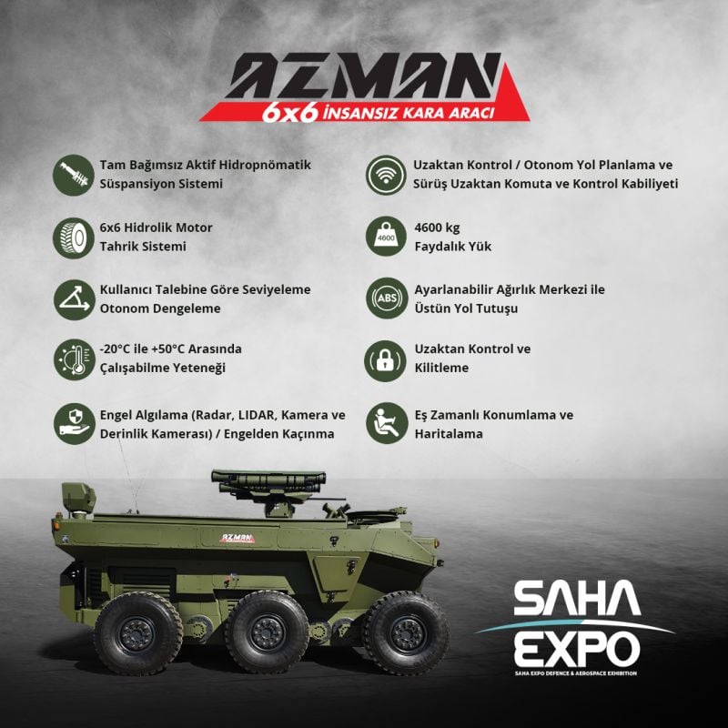SAHA EXPO’da Defence Turk’un sorularını yanıtlayan HİDROAN Ankara Hidrolik Makine Sanayi Fabrika Müdürü Neşet Dağdelen 6 ton ağırlığında olan AZMAN’ın, otonom olması hasebiyle yazılımsal olarak bir komuta merkezinden aracın istenen bir yerden diğer istendiği yere yönlendirilebileceğini ifade etti. Ayrıca Dağdelen,  bölgeye ulaşan insansız kara aracı AZMAN’ın üzerindeki silah sistemlerini kullanarak o bölgedeki operasyonu tamamlama kabiliyetine sahip olduğunu aktardı.