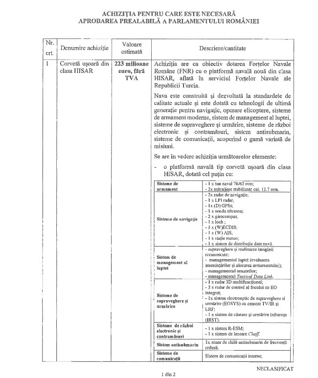 Romanya Deniz Kuvvetleri, Türkiye Cumhuriyeti envanterine yeni giren hazır durumdaki bir HİSAR sınıfı açık deniz karakol gemisini, hükümetler arası anlaşmayla devralacaktır. Bu yöntem sayesinde Romanya Deniz Kuvvetleri; hibrit tehditlere karşı yanıt verme, kritik altyapının korunması, müttefik operasyonlara destek sağlama, caydırıcılık ve deniz varlığının güvence altına alınması, asimetrik savaşa uyum sağlama ve bölgesel ortaklıkların güçlendirilmesi yoluyla Romanya’nın güvenliğine katkı sunabilecektir.”