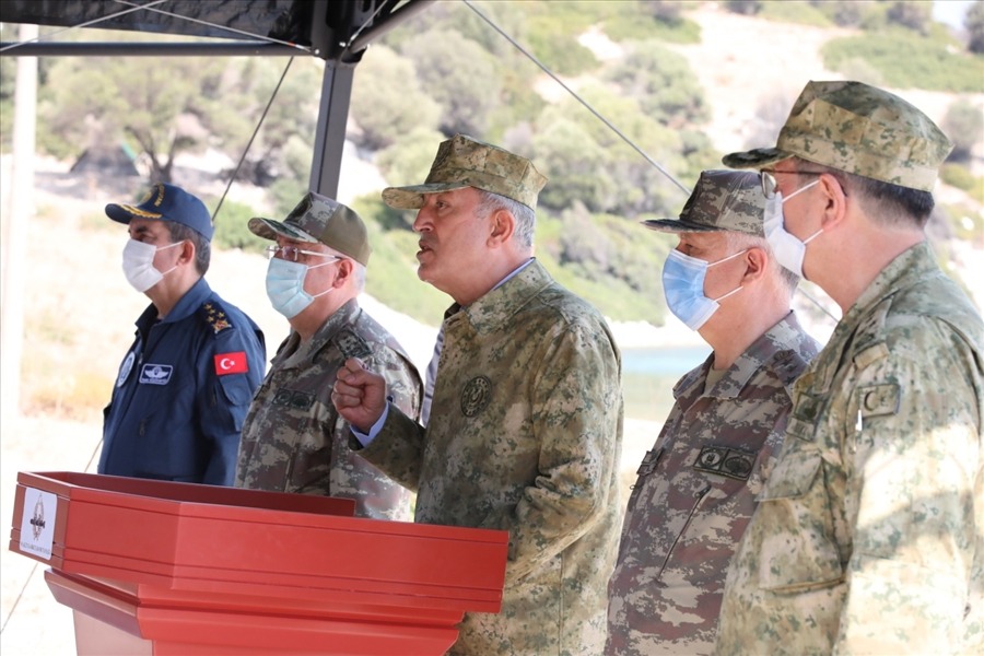 Savunma ve askeri konuların yanı sıra Doğu Akdeniz’deki gelişmelere de değinen Bakan Akar, “Her zaman söylediğimiz gibi biz barıştan, diyalogdan, siyasi çözümlerden yanayız. İyi komşuluk ilişkileri ve anlaşmalara, herkesin hukukuna saygılıyız ancak bunun yanı sıra ülkemizin, milletimizin hak alaka ve menfaatlerini korumak ve kollamakta son derece azimli kararlıyız ve buna muktediriz. Ne zamana kadar? Ölünceye kadar. Ölürsem şehit, kalırsam gazi anlayışı ile mücadelemizi sürdürmeye devam edeceğiz.” ifadelerini kullandı.