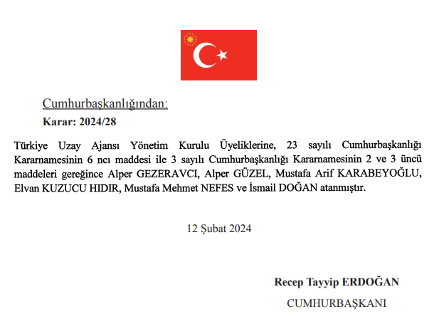 Atama kararları kapsamında Türkiye Uzay Ajansı Yönetim Kurulu üyeliğine 6 yeni isim atandı. Bu isimlerden biri, Uluslararası Uzay İstasyonu’nu bilimsel deneyler gerçekleştirmek üzere ziyaret ederek yurda dönen Türkiye’nin ilk astronotu unvanına sahip Alper Gezeravcı oldu.