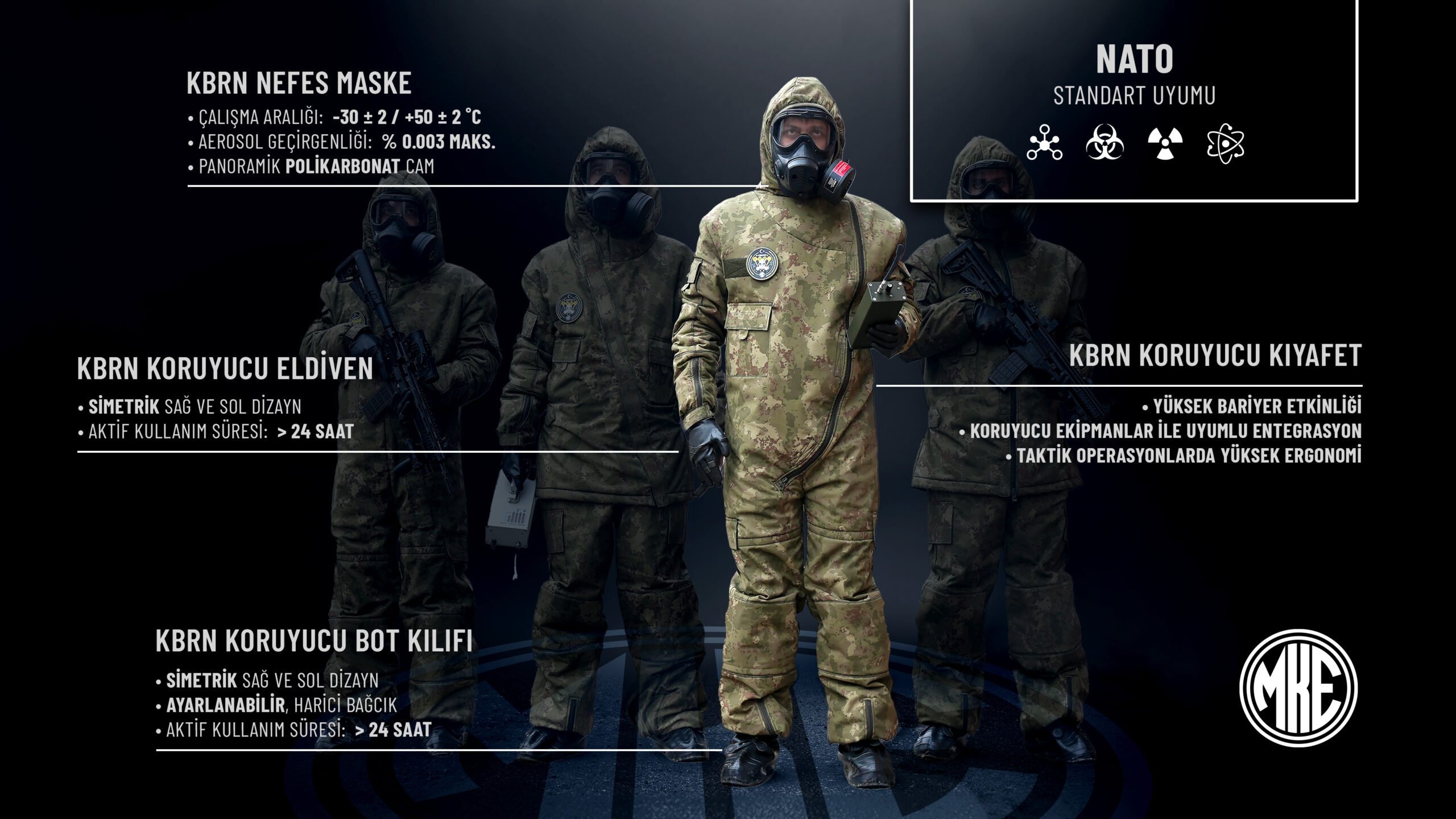 Bünyesinde bulunan AR-GE laboratuvarlarında, KBRN risklerine karşı yerli ve millî çözümler geliştiren MKE, yüksek teknolojili koruyucu kıyafetlerin üretimini aralıksız sürdürüyor. Aktif karbon teknolojisi ile çok katmanlı olarak tasarlanan koruyucu kıyafetler, en zorlu operasyonel koşullarda dahi mehmetçiğe ileri düzeyde koruma sağlıyor.