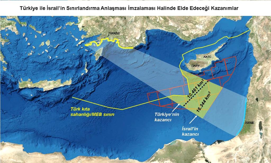 Cihat Yaycı: Türkiye – İsrail olası MEB anlaşması sürecinde, Türkiye’nin İsrail kamuoyuna ve yetkililerine, İsrail’in 2010 yılında GKRY ile yaptığı anlaşma kapsamında 4600 km2 büyüklüğünde bir deniz alanını GKRY’ye vermiş olduğunu, Türkiye ile anlaşma akdetmesi durumunda 16344 kilometrekare denizalanı kazanacağını ve böylelikle İsrail’in, Afrodit yatağının da bulunduğu GKRY’nin sözde 12 numaralı parselinin tümüne; 1, 7, 8, 9, 10, 11’in bir kısmına sahip olacağını, sonuç itibari ile sahip olacakları zenginlikleri anlatması gerekmektedir. İsrail ile anlaşma yapmanın Filistin ile de anlaşma yapmak anlamına geleceğini, zira Filistin’in Gazze Şeridinin de karşılıklı kıyı kapsamında olduğunu belirtmek isterim. Bu ilerde Filistin’e de müktesep hak sağlayacaktır. Böyle bir anlaşma ile Türkiye, İsrail (ve de Filistin) kazanacak, kaybeden GKRY olacaktır.