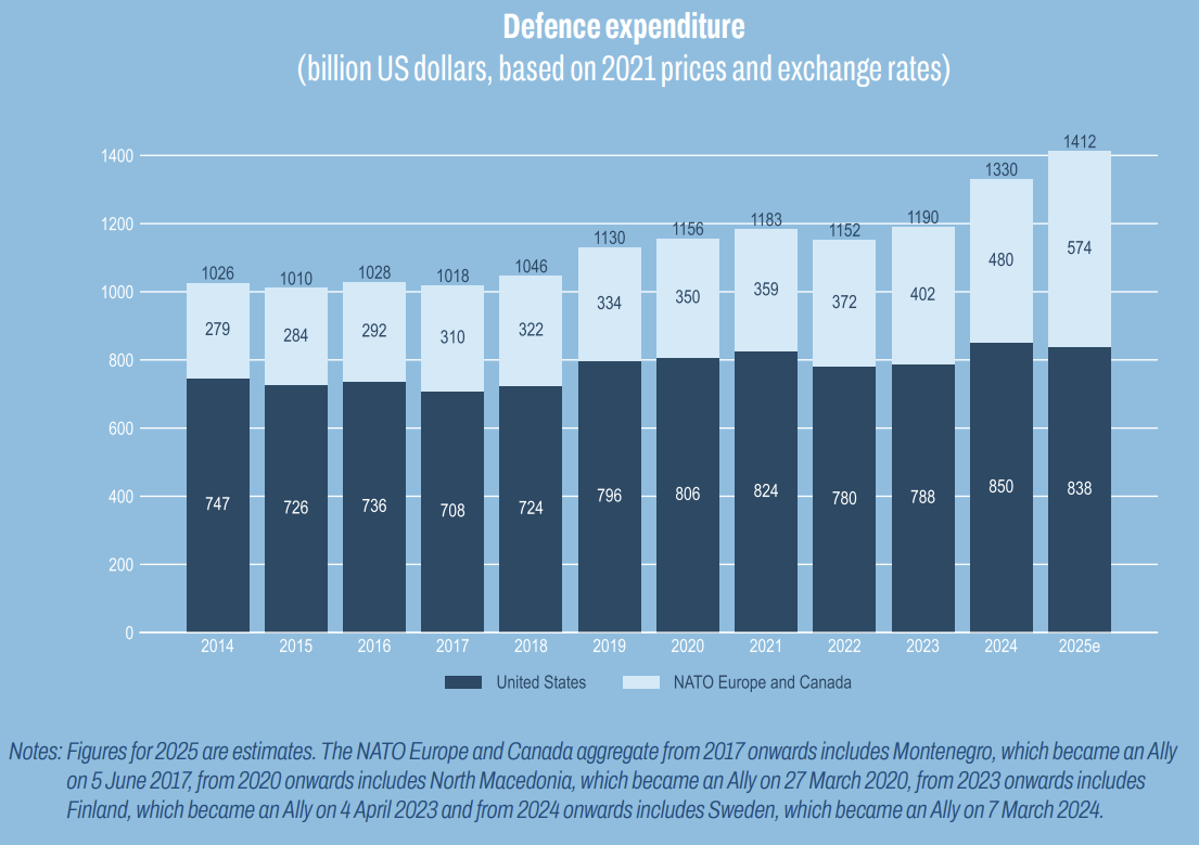 ABD halihazırda NATO ülkelerinin savunma harcamalarının %60’ını karşılamaya devam ederken Avrupa ve Kanada’nın katkıları 2024 yılına göre 94 milyar dolarlık artışla %20 yükseldi. Ülkelerin harcamalarının büyük kısmını personel ve operasyonlardan ziyade yeni silah sistemlerinin tedariki ve Ar-Ge süreçlerine yönlendirildiği ortaya çıktı.