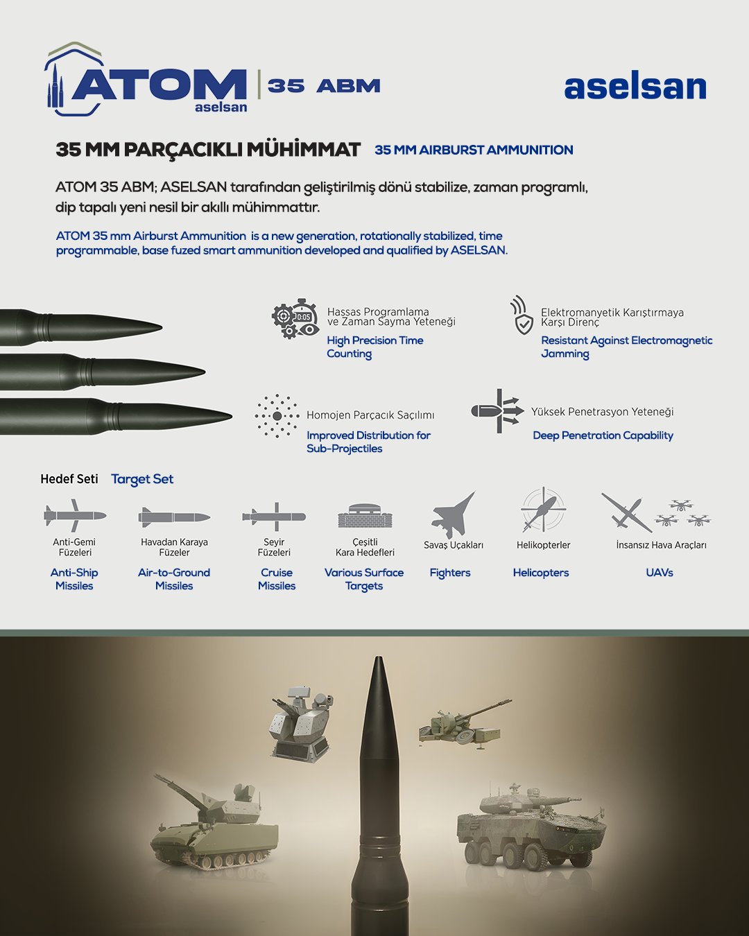 ASELSAN tarafından geliştirilen ve kalifiye edilen ATOM 35 mm Parçacıklı Mühimmat (ATOM 35 ABM); yeni nesil, dönüş hızıyla stabilize edilen, zaman programlı ve dip tapalı bir akıllı mühimmattır. Namlulu silahların etkinliği önemli ölçüde artıran mühimmat, savaş uçakları ve helikopterler gibi geleneksel hava hedeflerinin yanı sıra, havadan karaya füzeler, seyir füzeleri ve insansız hava araçları gibi modern hava tehditlerine karşı da etkili hale gelmektedir.