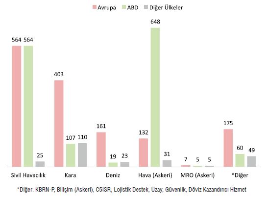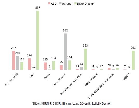 Kişi başı ciro 147.539 dolar olurken yukarıdaki ciro kırılımına göre ihracattaki en büyük pay kara platformları/sistemlerine aittir. Kara platformlarını sırasıyla ikinci ve üçüncü olarak, havacılık (askeri ve sivil olarak) ve silah-mühimmat, füze sistemleri takip ediyor.