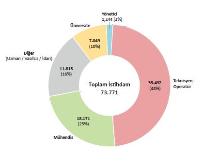 Verilere bakıldığında toplamda 73.771 kişinin istihdam edildiğini söylemek mümkün. Bu sayının yaklaşık %25’ini mühendisler ve diğer %10’luk bir dilimini de üniversite mezunu kişiler oluşturmaktadır. Teknisyenler istihdamın en büyük bölümünü oluştururken yönetici sınıfın azınlık bir dilime sahip olması dikkat çekiyor.