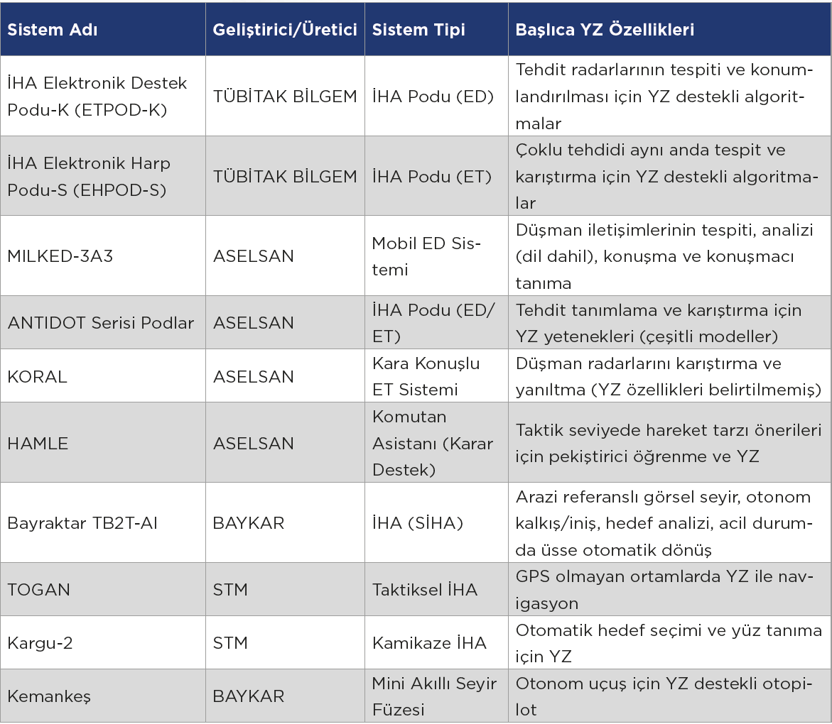 • “Tehdit Tanıma ve Sınıflandırma: YZ algoritmaları, geniş sinyal veri kümelerini analiz ederek tehditleri hızlı bir şekilde tanımlayabilir ve sınıflandırabilir. TÜBİTAK BİLGEM’in İHA EH podları, YZ destekli tespit ve teşhis algoritmalarını kullanarak tehdit oluşturan radarları belirleyebilmekte ve düşman EH düzenini ortaya çıkarabilmektedir. Benzer şekilde, genel olarak bilişsel ve YZ tabanlı EH sistemleri, tehditlerin tespiti ve analizi için kullanılmaktadır. ASELSAN’ın ANTIDOT 2-U/S podu da otomatik ve operatör kontrollü tehdit tanımlama özelliğine sahiptir.