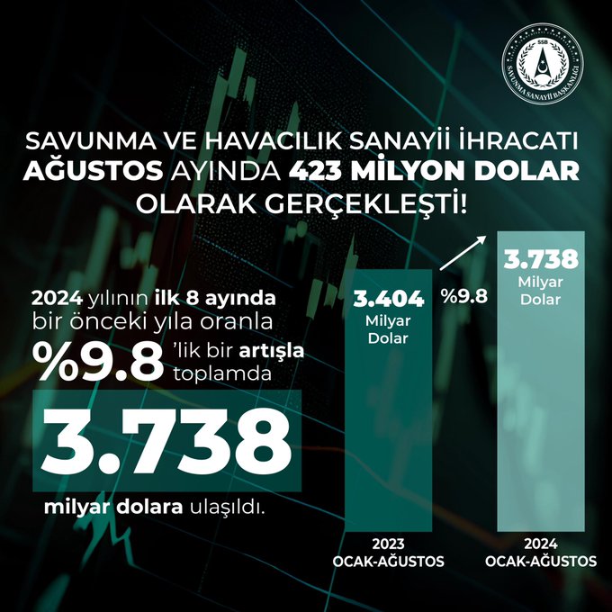 Türk savunma sanayisinin savunma ve havacılık sektöründeki Ağustos ayı yapılan ihracat oranı açıklandı. Savunma Sanayi Başkanı Prof. Dr. Haluk Görgün’ün X resmi hesabından duyurduğu ihracat rakamları geçen yılın Ağustos ayına göre %12.6 artışla 423 milyon dolar olarak gerçekleşti. Bu rakam özellikle uluslararası pazarda Türkiye’nin başarılı rolünü bir kez daha pekiştirmektedir. Öte yandan yaptığı paylaşımda 2024 yılının ilk 8 aylık bölümünde savunma ve havacılık sektöründeki ihracat oranına da değinen Görgün, geçen yılın aynı dönemine göre savunma ve havacılıkta ihracatın  %9.8’lik bir artış sergileyerek 3.738 milyar dolar olduğunu ifade etti.