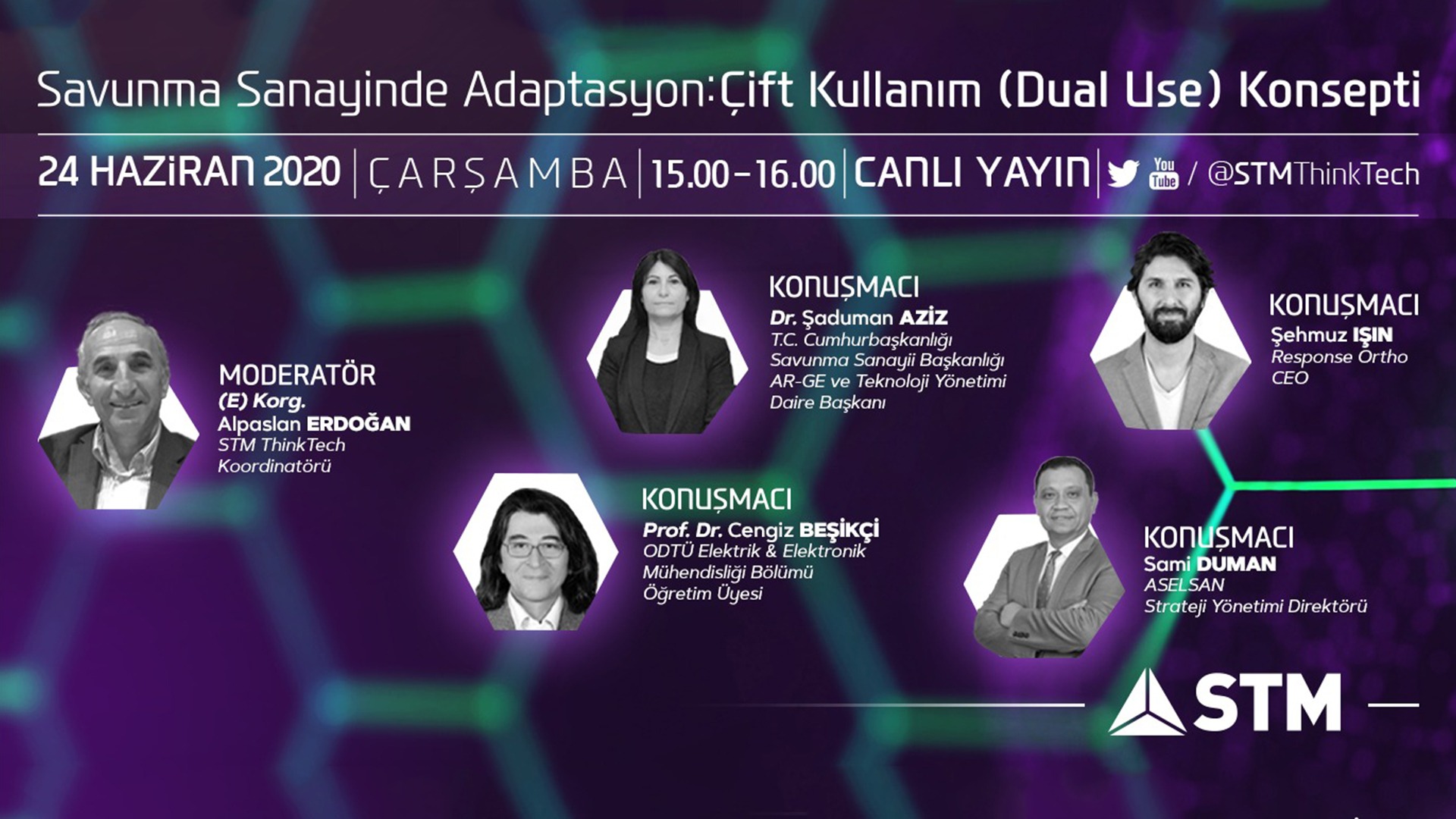 Türkiye’de teknolojinin çift kullanımı ve bu konseptin farklı sektörlere katkısını tartışmak üzere alanında yetkin isimler STM ThinkTechOnline|Focus toplantısında bir araya gelecek. STM ThinkTech Koordinatörü Emekli Korgeneral Alpaslan Erdoğan moderatörlüğünde gerçekleşecek “Savunma Sanayiinde Adaptasyon: Çift Kullanım (Dual-Use) Konsepti” başlıklı STM ThinkTechOnline|Focus Toplantısı’nda; T.C. Cumhurbaşkanlığı Savunma Sanayii Başkanlığı AR-GE ve Teknoloji Yönetimi Daire Başkanı Dr. Şaduman Aziz, ASELSAN Strateji Yönetimi Direktörü Sami Duman, ODTÜ Elektrik & Elektronik Mühendisliği Bölümü Öğretim Üyesi Prof. Dr. Cengiz Beşikci ve Response Ortho CEO’su Şehmuz Işın görüş ve öngörülerini paylaşacak.