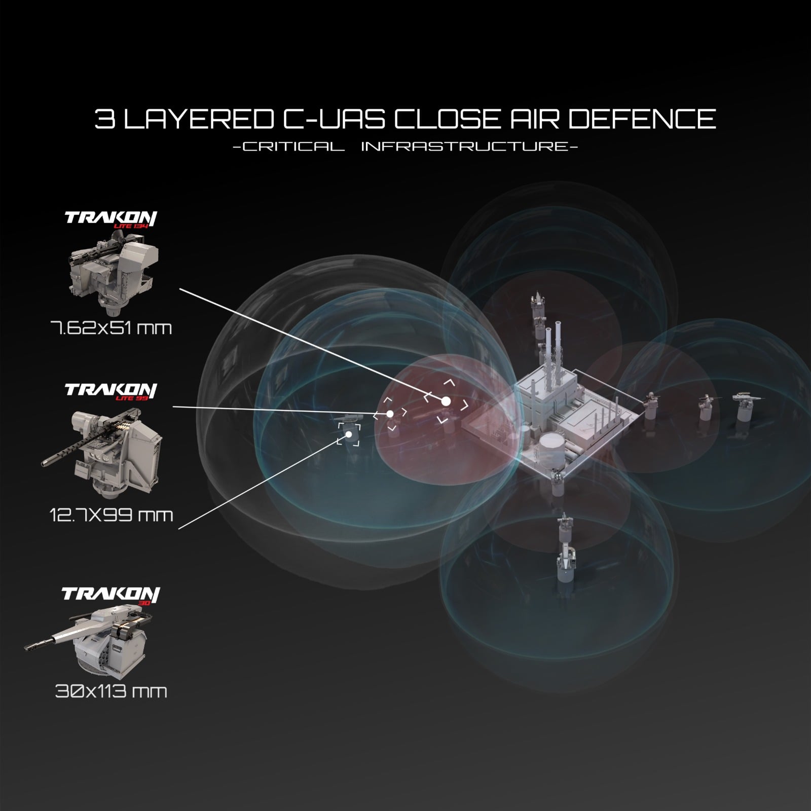 Orta katmanda, TRAKON 12.7 sistemleri ile dakikada 1.200 atım hızına ulaşabilen M3 ağır makineli tüfek; kamikaze drone tehditlerine karşı yüksek yoğunluklu ateş gücüyle aşılması güç bir savunma hattı oluşturmaktadır. Yakın savunma katmanında (son katman) ise TRAKON LITE 134 ile dakikada 3.000 atım yapabilen 7.62 mm M134 Minigun; daha küçük ve çok yakın mesafedeki tehditleri saniyeler içerisinde etkisiz hale getirmektedir.