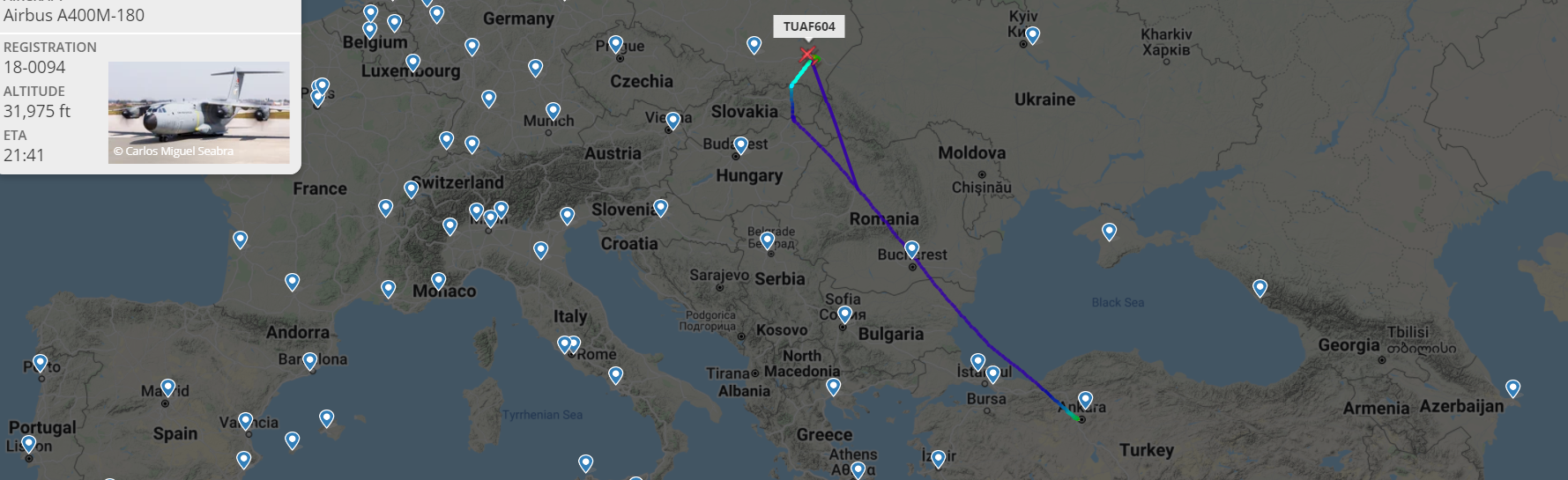 Türk Hava Kuvvetleri bağlısı A400M nakliye uçağı Eskişehir’den havalanarak Polonya’nın Rzeszow kentindeki Rzeszów–Jasionka Havalimanı uçuş gerçekleştirdi. Eskişehir’den 25 Şubat 2022 günü akşam saatlerinde kalkış yapan uçağın hangi rol ile Polonya’ya uçuş yaptığı henüz kesin olarak bilinmiyor. Bahse konu uçuşun Ukrayna’dan kara yolu ile Rzeszow kentine getirilen Türk vatandaşlarının tahliyesinin sağlanması amacıyla gerçekleştiriliyor olabilir.