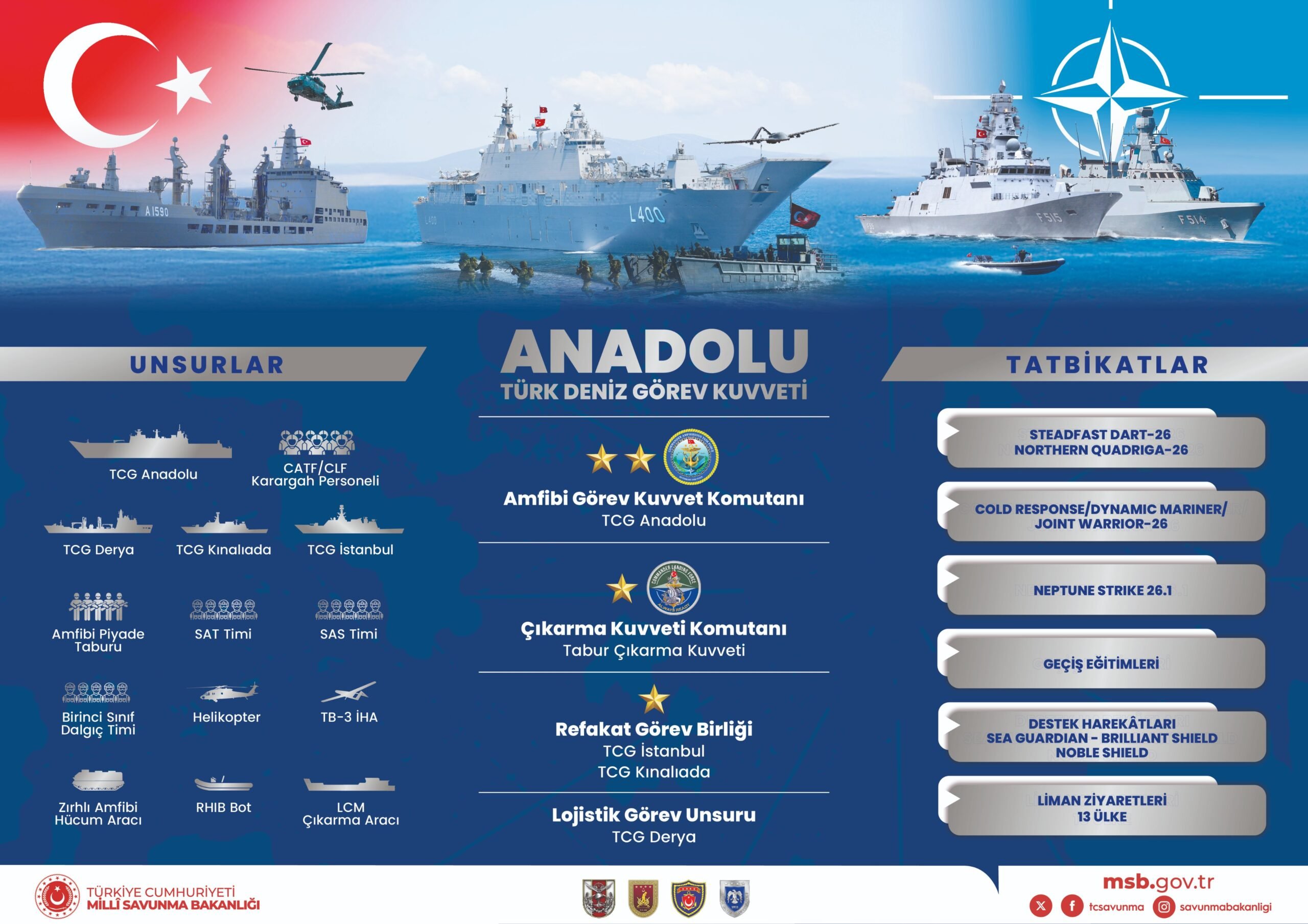 Bu görevler kapsamında, Anadolu Türk Deniz Görev Kuvveti; CATF ve CLF Karargâhları, TCG ANADOLU, TCG DERYA, TCG İSTANBUL, TCG KINALIADA, 20 Ocak-23 Nisan 2026 tarihleri arasında Akdeniz, Biskay Körfezi, Manş Denizi, Kuzey Denizi, Baltık Denizi ve Adriyatik Denizi’nde,