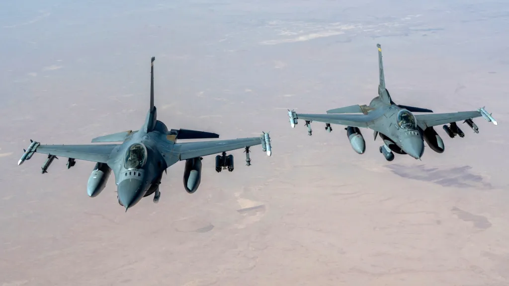 Ukrayna’ya ait F-16 savaş uçağı, APKWS II roketleri ve AN/AAQ-33 Sniper hedefleme podu ile görüldü.