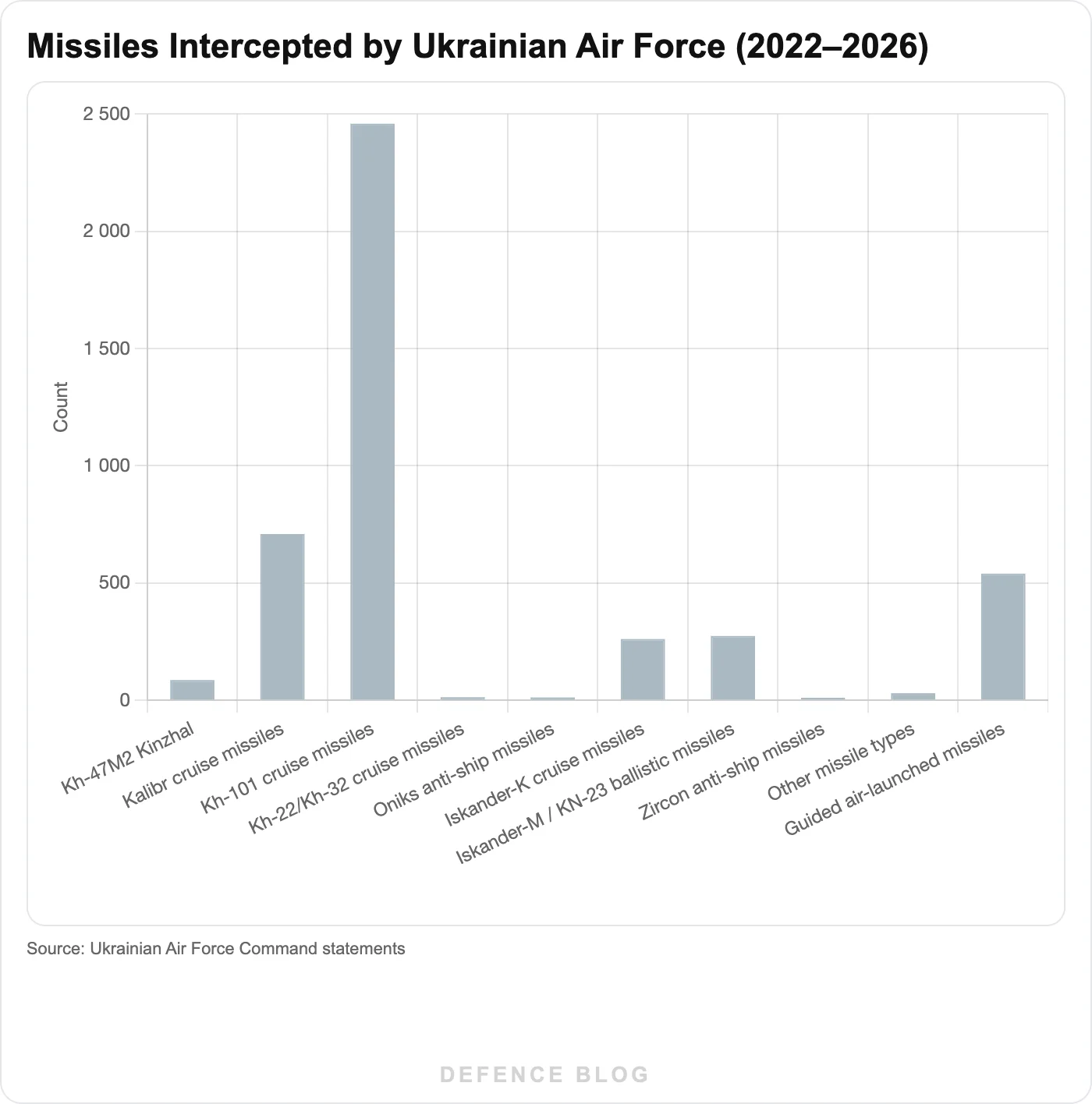Ukrayna Hava Kuvvetleri Komutanlığı’na göre hava savunma birlikleri Rus harekatlarında kullanılan çok çeşitli füze türlerini önledi. Komutanlık, çatışma sırasında 86 adet Kh-47M2 Kinzhal aerobalistik füzesi, 709 adet Kalibr seyir füzesi ve 2.459 adet Kh-101 seyir füzesinin imha edildiğini bildirdi. Veriler ayrıca 13 adet Kh-22/Kh-32 seyir füzesi ve 12 adet Oniks gemisavar füzesini de içeriyor.